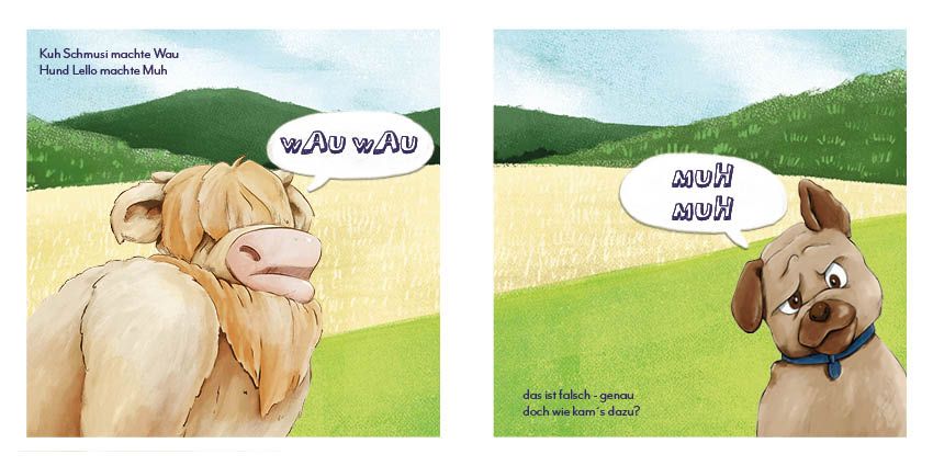 Bauernhof Kramer am Bodensee kam mir beim gemütlichen abhängen mit den Kids auf der Liegewiese der Reim in den Sinn. Plötzlich hatten Hund und Kuh ihre Sprache vertauscht, weil sie das Futter vom jeweils anderen gefressen haben. Meine Jungs hatten dann die rettende Idee, wie die Tiere ihre Sprache zurück bekommen. Hund Lello und Kuh Schmusi waren damals die Lieblingstiere meiner Söhne Theo und Hannes.